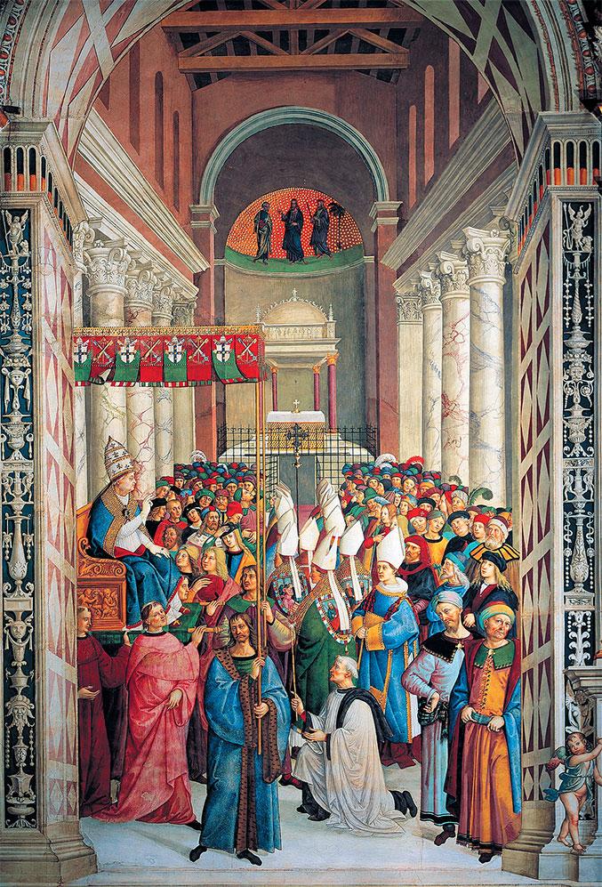 Пинтуриккьо, «Избрание Пикколомини папой под именем Пия II», фреска, 1502–1508, Сиена, Дуомо, библиотека Пикколомини