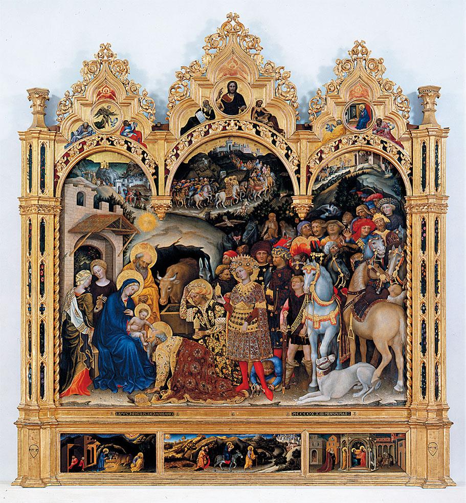 Джентиле да Фабриано, «Поклонение волхвов», дерево, темпера, 300×282, 1423. Флоренция, Галерея Уффици