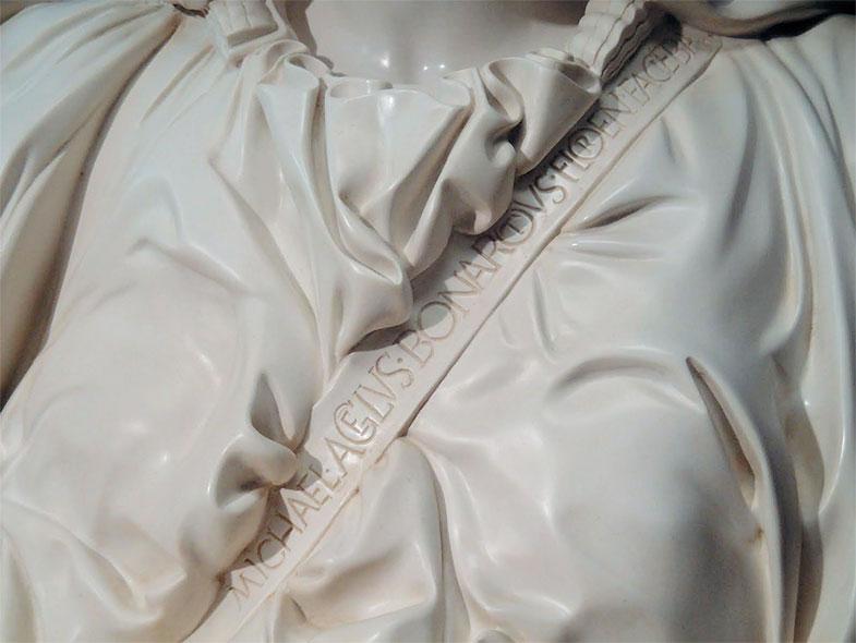 Микеланджело Буонарроти, «Пьета», мрамор, высота 174, 1499. Ватикан, собор святого Петра. Деталь (верхняя часть фигуры Марии с лентой, несущей автограф)