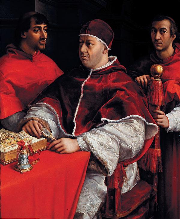 Рафаэль Санти, «Портрет папы Льва X с кардиналами Джулио Медичи и Луиджи деи Росси», дерево, масло, 154×119, 1518–1519. Флоренция, Галерея Уффици