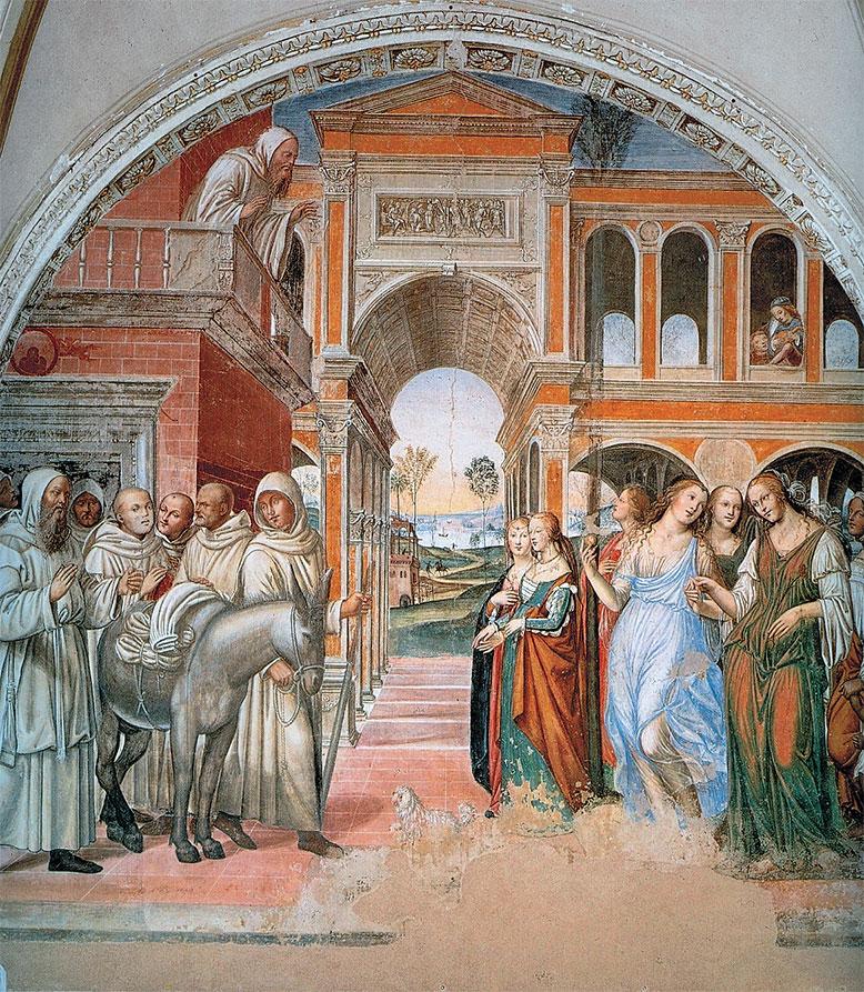 Содома, «Святой Бенедикт отсылает назад куртизанок, присланных монахом Флорентиусом», фреска, 1505–1508, Аббация, Монте Оливето Маджоре