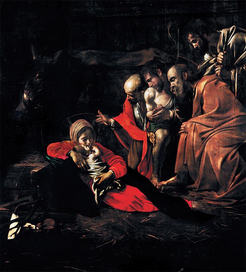 Микеланджело Меризи да Караваджо, «Поклонение пастухов», холст, масло, 314×211, 1609, Мессина, Региональный музей.