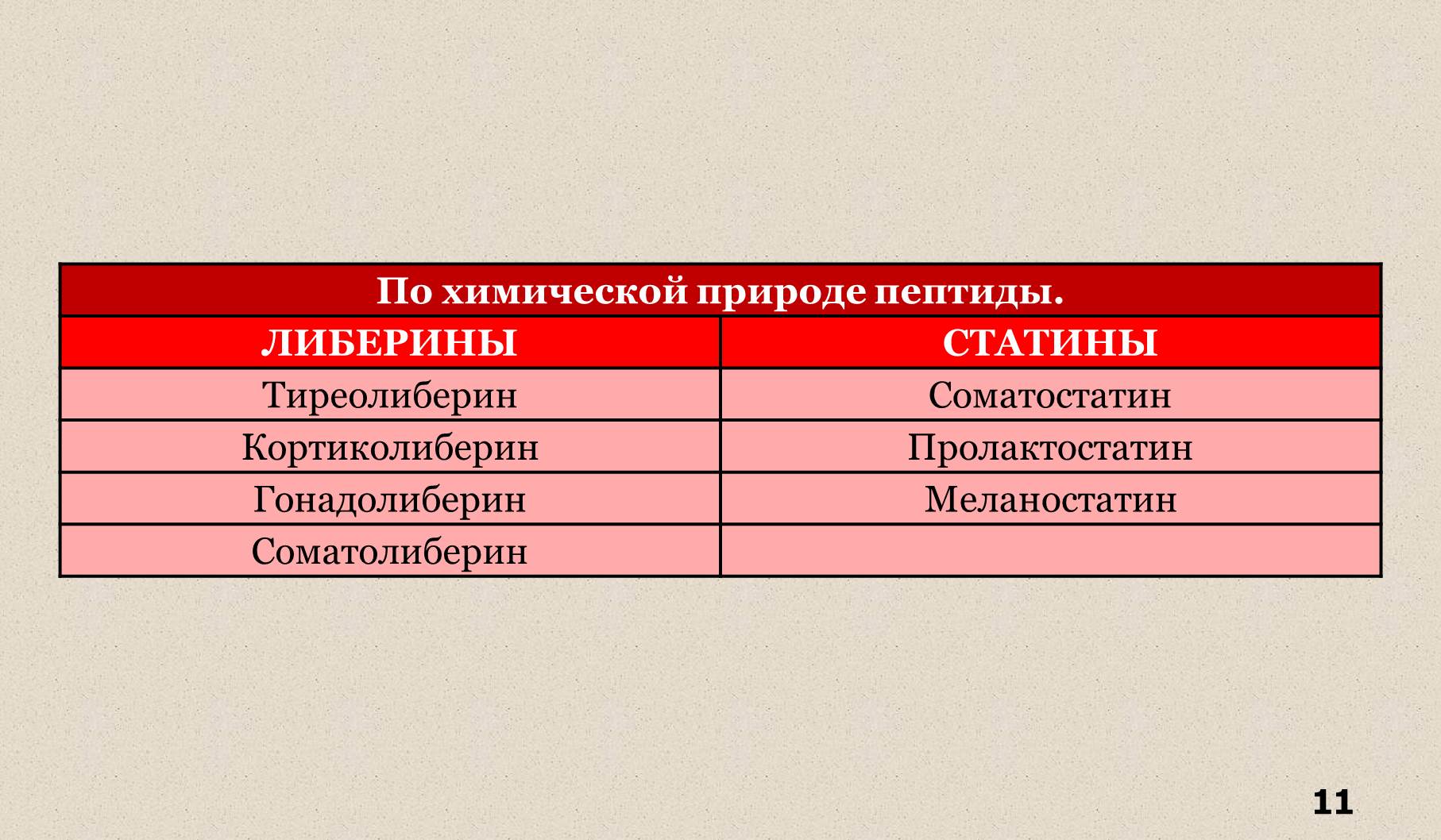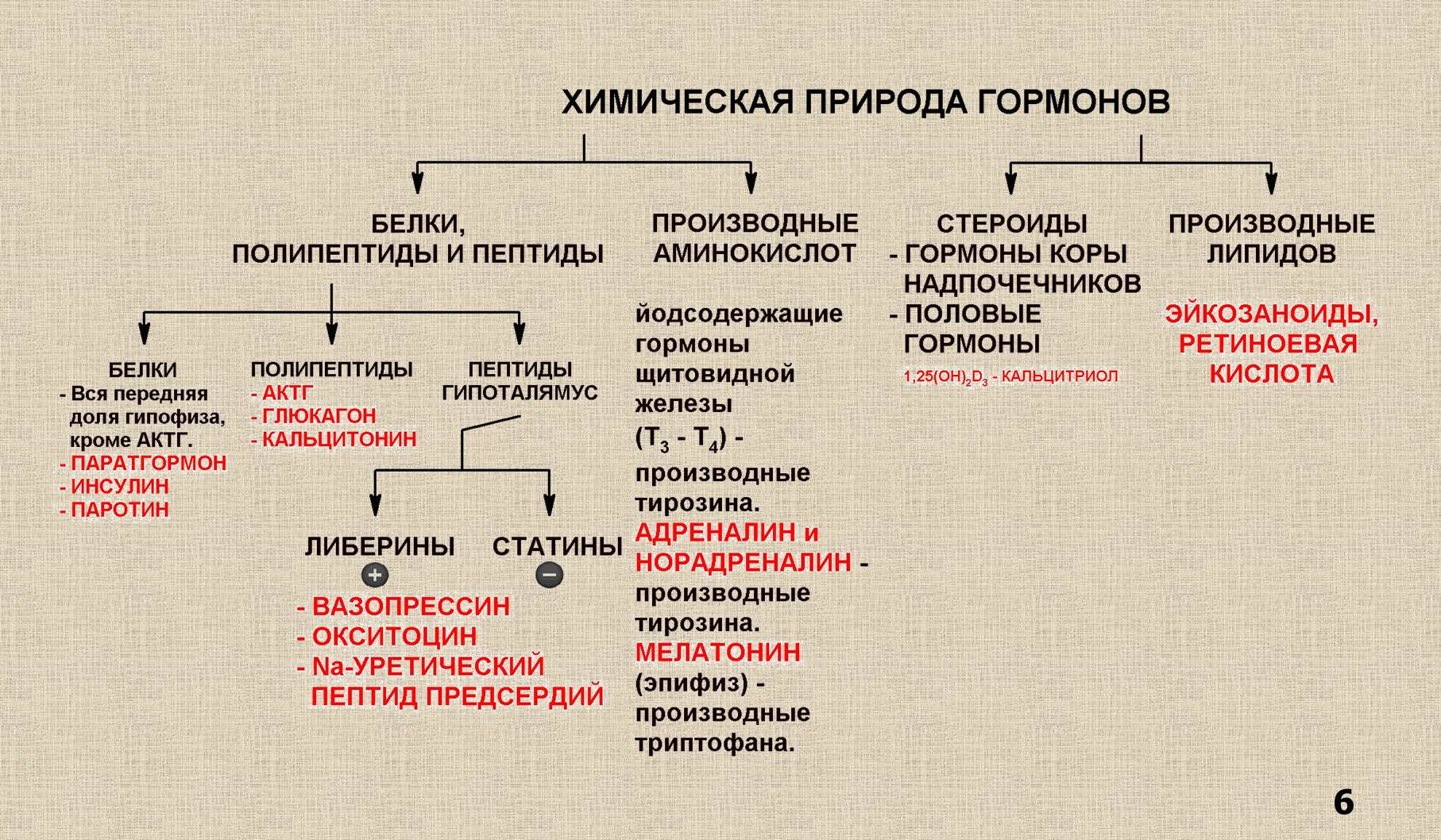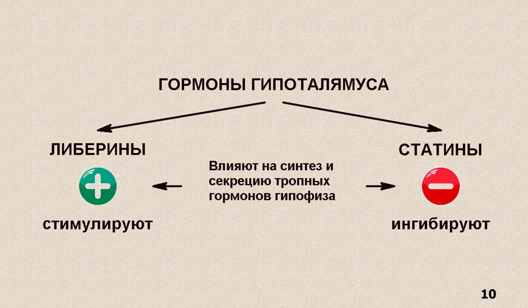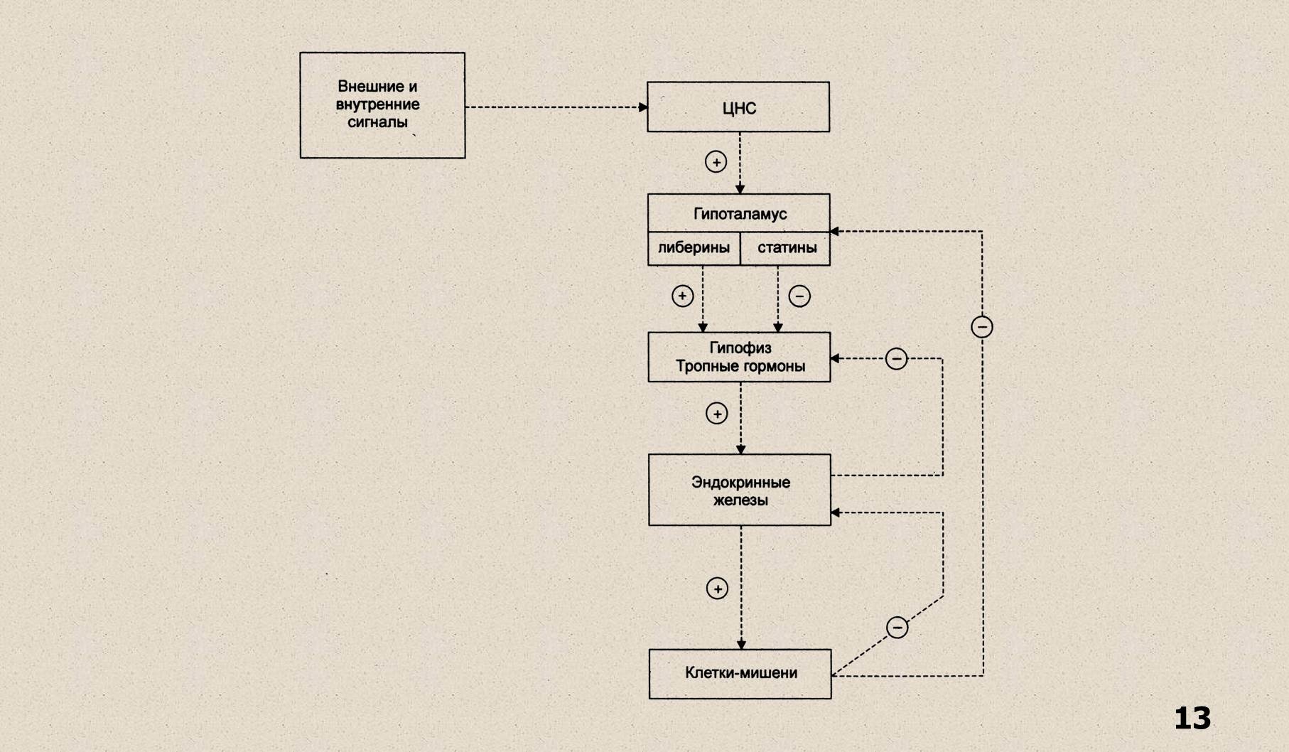 Как видно из схемы сигналы по нейронам поступают в гипоталямус где стимулируют синтез и секрецию либеринов и статинов, которые влияют на тропные гормоны гипофиза соответственно: либо усиливают их секрецию (либерины), либо ингибируют (статины). Гормоны гипофиза стимулируют синтез и секрецию гормонов эндокринных желёз, те идут в кровь, а затем в клетки – мишени, которые в свою очередь подавляют синтез гормонов эндокринных желёз, а те тропные гормоны гипофиза. Клетки – мишени подавляют также секрецию гормонов гипоталямуса.