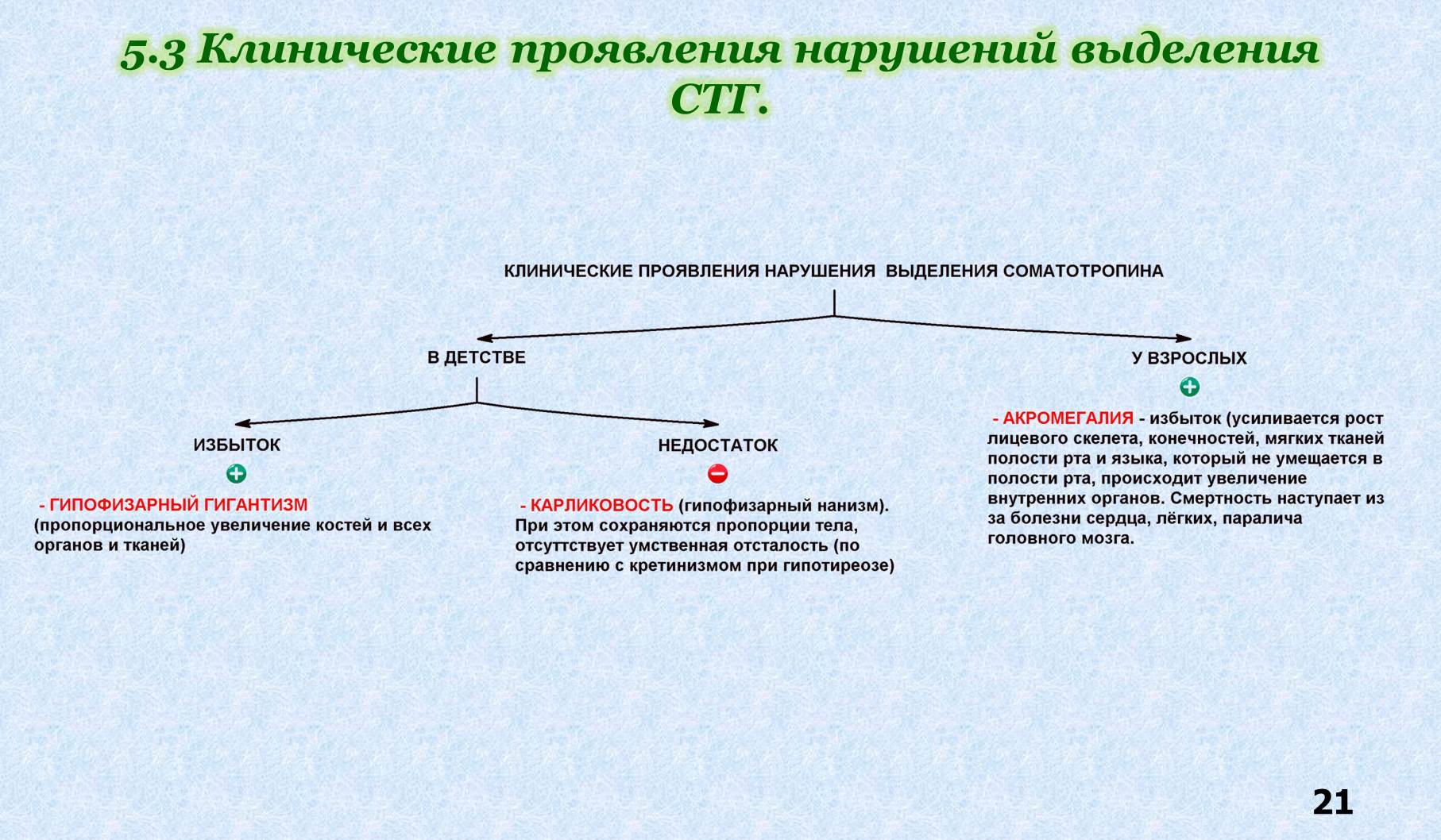 Соматотропин влияет на рост скелета и мягких тканей за счёт взаимодействия соматомединов, способствует включению сульфатов в протеогиканы (ПГ), усиливает хондрогенез и стимулирует образование костной ткани, контролирует баланс Са++, Mg++, задержку Na+, K+, Cl-. В жировой ткани усиливает липолиз, особенно при недостаточности инсулина и снижении использования глюкозы, в печени ускоряет глюконеогенез, отсюда – гипергликемия. Особенно увеличение глюкозы в крови при повышенном образовании СТГ (опухоль), в этом случае энергия образуется при распаде жиров в большом количестве и тормозится поступление глюкозы в клетку. СТГ называют диабетогенным гормоном.