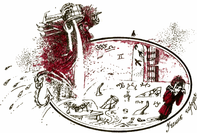 И тут комната вдруг погрузилась во мрак, дом задрожал, громовые раскаты прокатились по всем покоям, и перед учеником чародея появилось ужасное страшилище, изрыгающее огонь, с глазами, словно горящие факелы. Это был сам дьявол Вельзевул, покорный чародею! Юноша нечаянно вызвал его заклинанием.