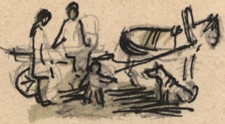 Мальчик смотрел на довольно крупную рыжую дворнягу, а женщина напоминала ему: «Костенька, не подходи к собаке. Костенька, отойди от лошади».