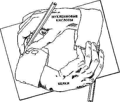 Нуклеиновые кислоты не могут ни воспроизводиться, ни регулировать синтез белков без помощи уже существующих белков; белки же не могут быть синтезированы без информации, заложенной в уже существующих нуклеиновых кислотах. Одна из наших важнейших проблем заключается в том, чтобы понять, каким образом могла возникнуть эта ситуация "яйца и курицы". 9