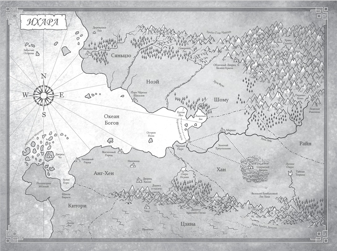 Нефритовый Форт, усадьба Ханно в центральном Анг-Хене, располагался на возвышенности среди поросших лесом долин. Он получил своё название из-за яркого нефритового цвета сосен, которые разрослись во всех направлениях и колыхались на ветру, тем самым создавая впечатление острова в центре глубокого золотисто-зелёного моря. Звуки тренировочного павильона стихли, Кетаи повёл Майну через территорию и вошёл в форт через парадный вход. Над головой развевались знамена с гербом Ханно.