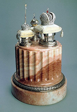 Миниатюрные копии императорских регалий на мраморном пьедестале. Конец XIX в. Фирма П. К. Фаберже
