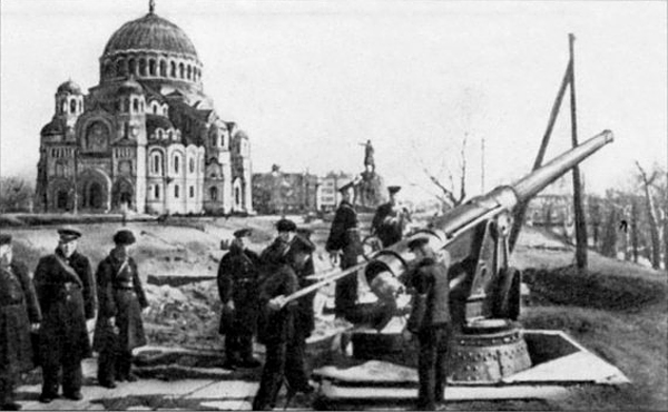 Артиллерийская батарея на Якорной площади в Кронштадте. Апрель 1942 г.