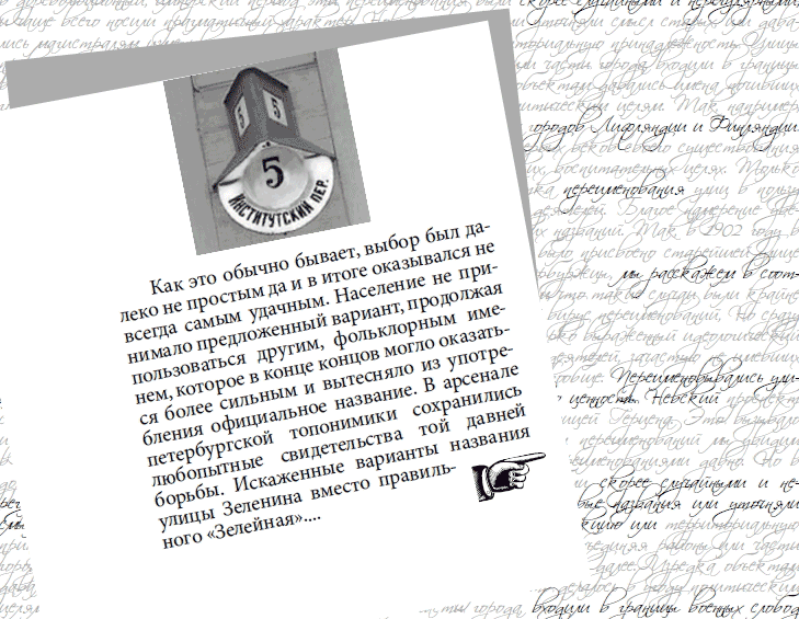 Как это обычно бывает, выбор был далеко не простым да и в итоге оказывался не всегда самым удачным. Население не принимало предложенный вариант, продолжая пользоваться другим, фольклорным именем, которое в конце концов могло оказаться более сильным и вытесняло из употребления официальное название. В арсенале петербургской топонимики сохранились любопытные свидетельства той давней борьбы. Искаженные варианты названия улицы Зеленина вместо правильного «Зелейная», Моховой – вместо «Хамовой», Торжковской – вместо «Торжокской», поселка Осиновой Рощи – вместо «Осиной Рощи» и многие другие давно вошли в обиходный оборот и пользуются вполне понятным официальным статусом. По тонкому замечанию специалистов, «эти ошибки давно уже стали историческими и обжалованию не подлежат». Названия превращались в символы, и их этимология интересовала разве что исключительно узкий круг любопытных.