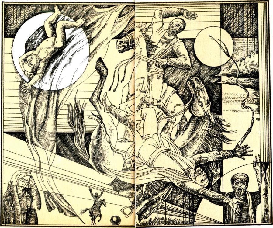 Человек десять бросились к нему, бережно подняли и вынесли из мечети. Юродивый между тем, не обращая внимания на общее смятенье и подражая распевающему голосу имама, понес несуразицу: