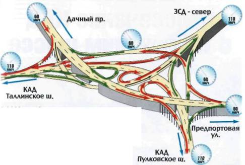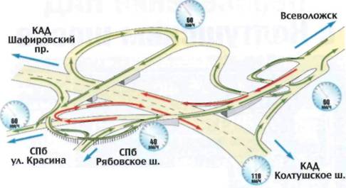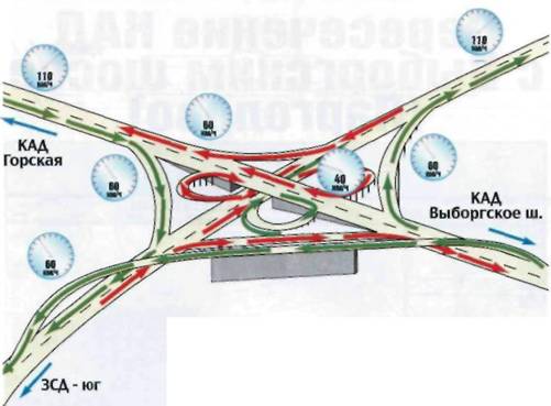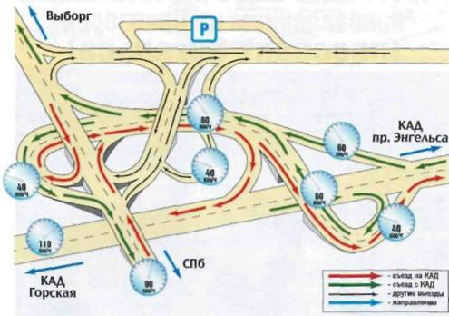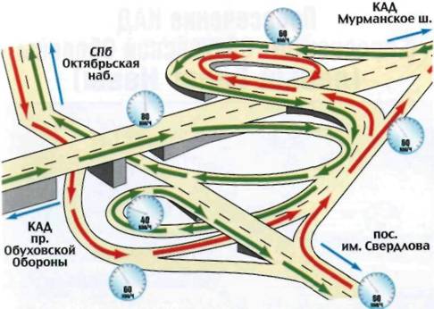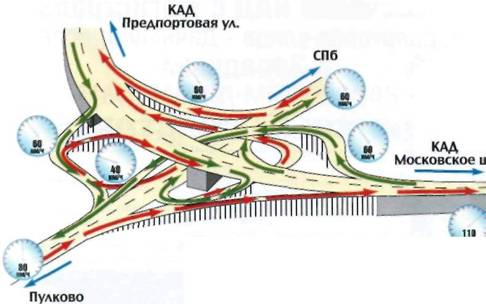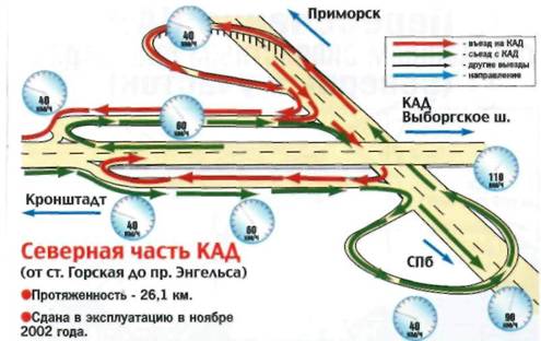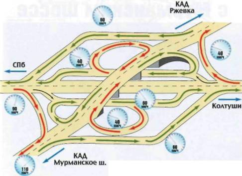 • на КАД невозможно въехать вне развязок: все дороги, которые пересекает магистраль, проходят над ней или под ней