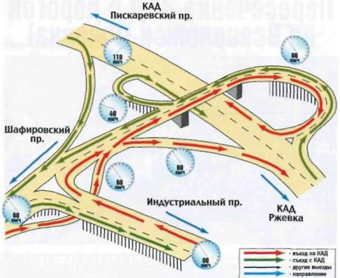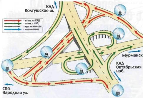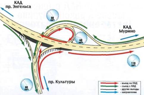 Схема развязки – Т-образная, двухуровневая. Водителям следует обратить особое внимание при съезде с КАД на проспект Культуры: там соединяются два автомобильных потока.