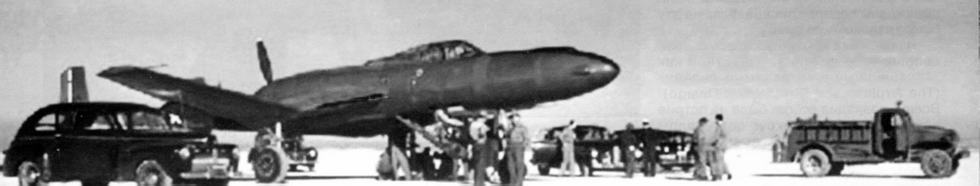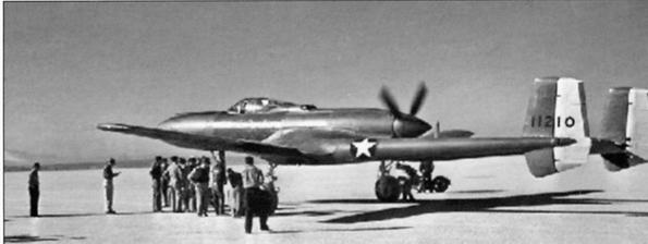 Специалисты фирмы «Валти» у самолета ХР-54 после окончания испытательного полета. Авиабаза Мюрок, январь 1943 г.