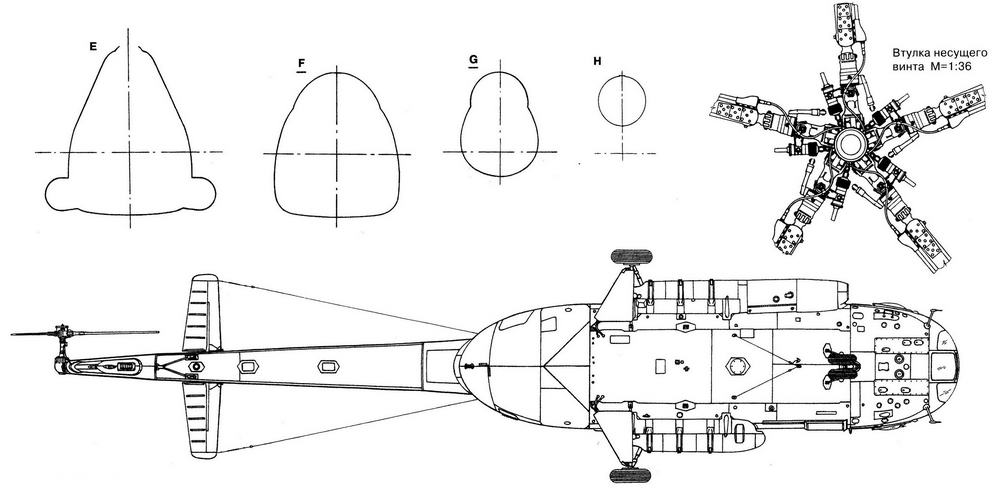 Несущий винт состоит из втулки и пяти лопастей. Втулка НВ имеет разнесенные горизонтальные, вертикальные и осевые шарниры и снабжена гидравлическими демпферами, втулки выполнен из высокопрочной легированной стали. Диаметр втулки – 1,74 м; масса – 610 кг. Лопасти НВ прямоугольной формы в плане с хордой 520 мм. Максимальный угол установки лопастей – 14°30’, минимальный – Г. Контур поперечного сечения лопасти образован профилем NACA– 230 с модифицированной хвостовой частью (задняя кромка профиля приподнята над линией хорды). Относительная толщина профиля – 11,38%. Лопасть выполнена с геометрической круткой – угол превышения линии хорды сечения над базовой плоскостью лопасти меняется вдоль ее размаха по линейному закону от 5" (у комля) до 0" (у законцовки). Лопасть цельнометаллической конструкции, она состоит из алюминиевых лонжерона, 21 хвостового отсека и концевого обтекателя, а также стального комлевого наконечника для крепления к втулке. Масса лопасти – 140 кг. Лонжерон – пустотелая балка с замкнутым контуром, образующая носок лопасти. Хвостовые отсеки трехслойной конструкции с сотовым заполнителем. Они склеены между собой и приклеены к лонжерону. В носке лонжерона располагается противофлаттерный груз, состоящий из восьми отдельных стальных брусков длиной по 400 мм и массой до 1 кг каждый.