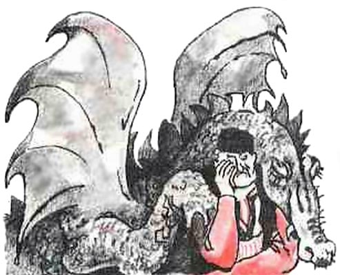 Идёт мимо скалы, а из пещеры под скалой навстречу ему дракон выползает. Зубы прямые да острые, как кинжалы, из пасти торчат, когти кривые, словно турецкие ятаганы.