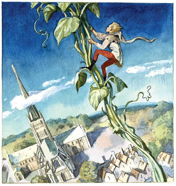 Наутро проснулся Джек, чувствует, что-то не так: солнце снаружи вовсю светит, а в комнате почему-то сумерки. Спрыгнул с кровати, и угадайте, что он увидел? Бобы-то упали на землю, ну и, конечно, взошли, да за одну ночь и выросли. Стебли толщиной в руку и так переплелись, ни дать ни взять – настоящая лестница. Выглянул Джек из окна, задрал голову вверх, а конца-то у лестницы и не видно.