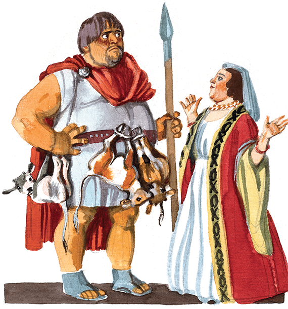 В этот миг в кухню вошёл великан, какого и вообразить себе трудно; на поясе три телёнка висят, связаны за ноги. Бросил огр их на пол и говорит: