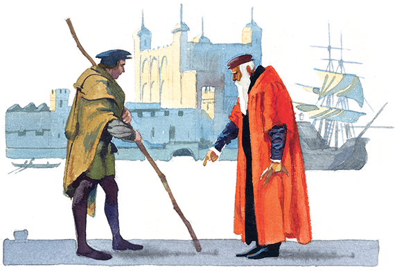 С посохом идти стало легче. Шагает Эван по дороге, весело насвистывает, и дошагал наконец до Лондона. Вошёл через городские ворота, каких много вокруг Лондона, и сразу двинулся к реке. Стоит на берегу, глазеет на корабли и лодки. Подходит к нему старичок, маленький, сгорбленный, с густой белой бородой почти до пояса.