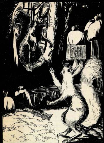 соседке: „попробую-ка я толкнуться к ней. Ведь она запасов натаскала много. Не поделится ли она со мною хоть чем-нибудь? А летом я ей все верну". Тихо постучала она в двери к запасливой белке. – Кто там ? – Я... твоя соседка. Та отворила двери и как увидела несчастную, исхудавшую, дрожавшую от холода белочку, сразу все поняла. – А... пожалуйте, кстати, прямо на обед. Вот тут во мху согрей лапки, а я подам тебе шишек, желудей, орешков... Ну, согрелась? Теперь кушай, грызи. А я вот все одна живу, мне скучно... Давай жить вместе до лета, а потом вместе будем и работать, и помогать друг другу". С той поры обе белки поселились вместе.