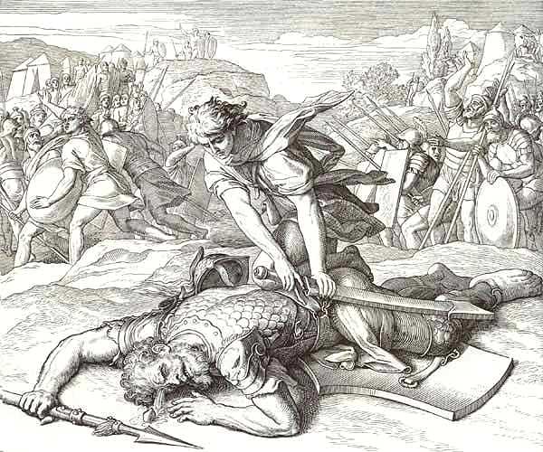 51 Тогда Давид подбежал и, наступив на Филистимлянина, взял меч его и вынул его из ножен, ударил его и отсёк им голову его; Филистимляне, увидев, что силач их умер, побежали.
