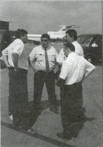 На другой странице: Домодедово, 4 июля 2001 г., сверху: Прибытие в Москву первого пассажирского рейса на самолете Ту-214; внизу: Главный конструктор Ту-214 Ю.Воробьев (в центре) беседует с летчиком-истпытателем ОКБ Туполева А. Журавлевым (слева) и хабаровскими летчиками (справа).
