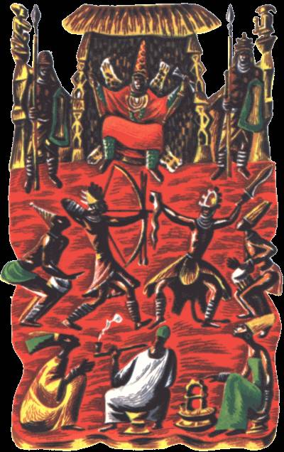 – Ну, теперь ваша очередь, идите ямс сажать. Потрудились жены славно, быстро ямс посадили. Жена Эбоппа приходилась дочерью владыке небесному Обасси Осо. Раз за ужином прибегает от него гонец.