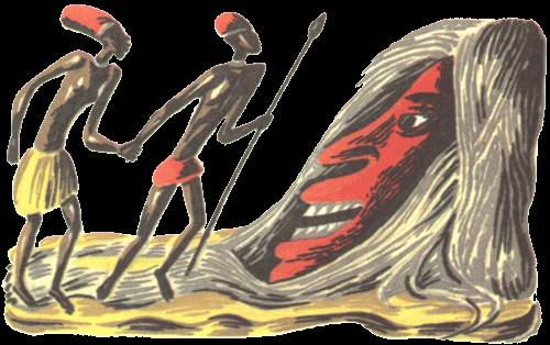 Тими приладил пламенную стрелу. Но Гбонка не поднял ни копья, ни щита. В руках у него был только волшебный рог антилопы. Он спел песню, в конце которой были такие слова: