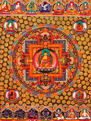 Одной их характерных особенностей тантрических текстов является то, что в них главное существо никогда не фигурирует одно, но всегда в окружении свиты. В восьмой главе «Сутры Основных Обетов Бодхисаттвы Кшитигарбхи» говорится о многочисленных царях демонов во главе с Ямой, а в девятой главе перечисляются имена девятнадцати будд. Потенциально эти персонажи составляют мандалу.