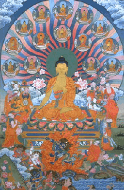 [Закрыть] Испустив такие неописуемые сияющие облака, он также испустил различные чудесные звуки, а именно: звук дана парамиты, звук шила парамиты, звук кшанти парамиты, звук вирья парамиты, звук дхьяна парамиты, звук праджня парамиты, звук сострадания, звук радостного даяния, звук освобождения, звук отсечения воздействий внешнего мира, звук мудрости, звук великой мудрости, звук львиного рыка,[22]22