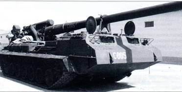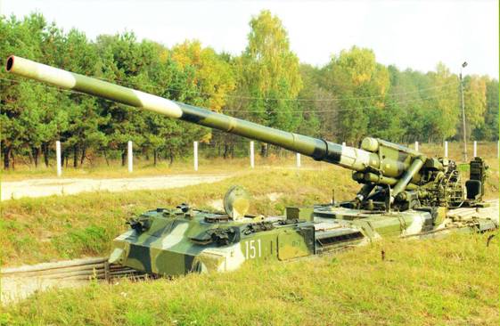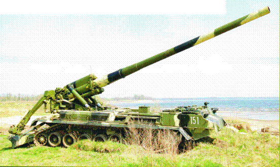 САУ 2С7М «Малка». Артсистема в положении «по-походному». Щитки командира и механика-водителя открыты. Сошник поднят.
