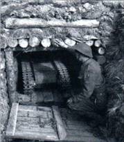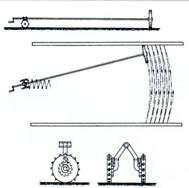 Рисунок из германского «имперского» патента №749380 от 1944 г. на «рунное приспособление для разведки наземных мин» – катковый минный трал в виде тяжелого катка на длинной оси. При вращении рукоятки ось поворачивается вручную в определенном секторе, устройство продвигается вперед на колесном «станке» и протраливает заданную полосу местности. Необходимость в таком «приспособлении» обосновывалась широким применением труднообнаруживаемых мин с деревянным корпусом.