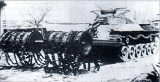 Рисунок из германского «имперского» патента №718880 от 1942 г., выданного доктору Адольфу Бишлагеру, на «наземный минный тральщик с тралящим приспособлением» (катковым противоминным тралом), управляемый по радио со специально оборудованного танка.