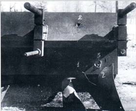 При обстреле макета с листовым дырчатым экраном 122-мм бронебойными снарядами с ударной скоростью 700 м/с от одного попадания в надкрылок все башмаки кронштейнов оказались оторванными по сварке от своих опорных планок. При вторичном попадании 122-мм бронебойного снаряда в надкрылок макета сварные швы, соединявшие надкрылок с другими деталями макета, оказались полностью разрушены, а сам надкрылок сброшен на землю.