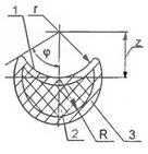 Поперечное сечение устройства кумулятивной защиты (удлиненного кумулятивного заряда) z – расстояние между осями заряда и выемки r – радиус цилиндровом поверхности выемки R – радиус внутренней поверхности оболочки заряда 1 – кумулятивная выемка 2 – ВВ 3 – оболочка