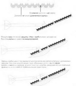 Вместе с продуктами детонации заряда кумулятивная струя будет влиять на средство поражения, разрушая его на отдельные фрагменты и отклоняя его от первоначальной траектории. Заряды срабатывают последовательно под влиянием дополнительных удлиненных зарядов, что обеспечивает последовательное воздействие на средство поражения.