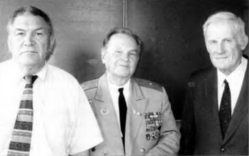 Генерал-майор в отставке, лауреат Ленинской премии и Государственных премий СССР Юрий Николаевич Мажоров (в центре), Алексей Николаевич Шулунов, директор института в 1990-е гг. (слева) и автор статьи (справа) в день 80-летия Мажорова