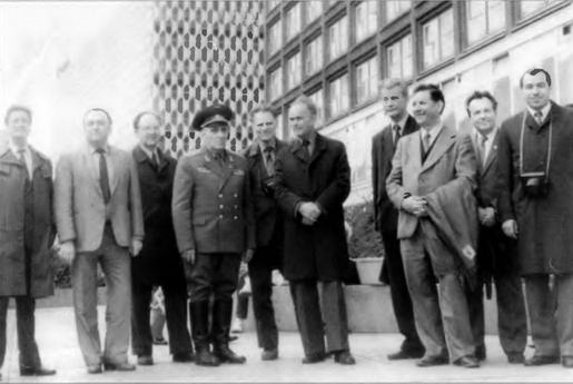 На берлинской улице – «звезды первой величины» отечественной «оборонки». Директор «сто восьмого» Ю.Н. Мажоров – второй справа; слева от него – С.П. Непобедимый, разработчик отечественных ракет «земля-земля»; левее – H.C. Попов, разработчик наших новых танков; еще левее Р.А. Беляков, руководитель самолетного КБ им. А.И. Микояна. Снимок 1982 г.
