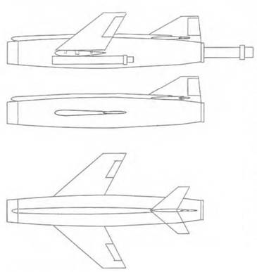 Самолет-снаряд был не только одноразовым но и однорежимным летательным аппаратом, предназначенным только для высокоскоростного полета, осуществляемого без резких маневров Это позволило уменьшить размеры не только крыла, но и цельноповоротного стабилизатора Отметим, что американцы на самолетах-снарядах «Снарк», «Регулус– 1» и «Регулус-2» вообще отказались от горизонтального оперения. Разумеется, подобная компоновка требовала размещения топливного бака в центре фюзеляжа для сведения к минимуму разбежки центра масс в процессе полета. С учетом малой площади нижнего киля по бортам в верхней части хвоста самолета-снаряда ввели два небольших гребня Внизу, по бокам от киля, установили по твердотопливному двигателю, объединенные в стартовый агрегат, сбрасываемый после выгорания топлива.