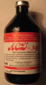 АСД-3 представляет собой маслянистую жидкость с резким запахом, применяется только наружно для лечения грибковых поражений кожи у домашних и сельскохозяйственных животных, дезинфекции ран, при различных заболеваниях кожи (экзема, псориаз, угревая сыпь, дерматиты, трофические язвы, нейродермит).