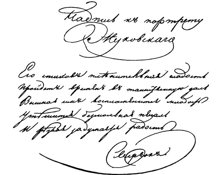 В собственноручной надписи Поэта к портрету Жуковского можно увидеть те же художественные поиски с буквой «Д».