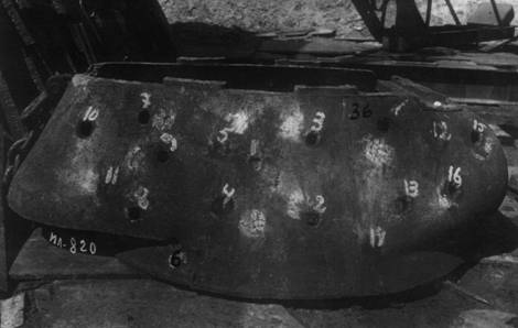 4. Виды поражений при испытании снарядами 37, 45 и 76 мм калибра следует считать вполне удовлетворительными, т. к. отколы имели место только в двух случаях – при попадании в зону литейных дефектов, при этом отколы были небольшого диаметра (70x120 мм.). Расколов не было, исключая нескольких трещин так же в зоне дефектов и конструктивных недостатков. Особенно следует отметить удовлетворительный результат испытаний башни 76 мм. снарядом.