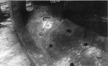 Внутренние литейные дефекты, необнаруженные наружным осмотром, были выявлены на башне лишь в результате ее снарядного обстрела. Такие дефекты были обнаружены в зоне носовой части башни (смотри выстрел 15) и в зоне кормы (ниши) при поражении выстрелом № 33.