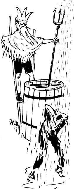 Раздались глухие частые удары, напоминающие барабанную дробь, и три струи брызнули из трезубца на провинившегося, обдав его водой с головы до ног.