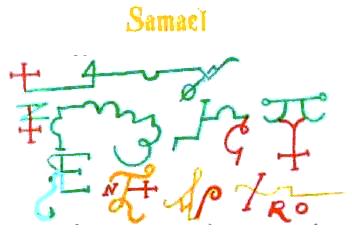 САМАЭЛЬ (SAMAEL) – Дух, который никогда не оставлял Святого Иоанна, пока он находился в пустыне перед своей проповедью. Он защищает проповедников во время их Миссий среди чужих народов. Он учит Богословию. Его следует вызывать в среду утром. Его Знак составлен таким образом (см. рисунок).