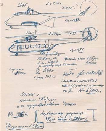 На рис. 1 представлен лист из дневника, на котором Миль сравнивает удельный расход топлива на вертолетах S-65 и Ми-8. Конструктор предлагает увеличить степень сжатия камеры и число ступеней двигателя, как минимум, на 2 для получения мощности 1700 л.с. Здесь же М. Л. Миль показывает вариант модернизации вертолета с увеличенной на метр кабиной. Позже это предложение было реализовано на вертолете Ми-18.