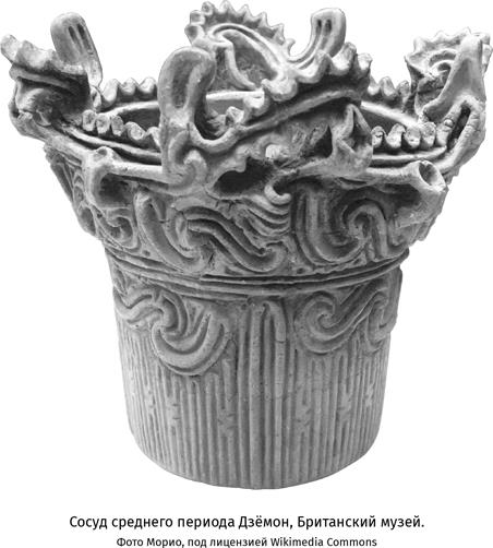 Эта эпоха берет свое название от характерной землистой керамики, которую тогда производили. Слово «дзёмон» означает «веревочный орнамент»: зачастую эта керамика была украшена орнаментом, полученным при вдавливании веревки или ветки в мягкую глину перед обжигом. Для керамики Дзёмон разработана следующая классификация: прото-Дзёмон, ранний, средний и поздний Дзёмон. Посуда прото-Дзёмон – это наиболее ранняя достоверно датированная керамика, обнаруженная в мире к настоящему моменту: ее изготавливали с 11 000 до 5000 года до н. э. Дно у этих сосудов обычно округлое или заостренное, и использовались они, по предположениям археологов, в основном для приготовления еды на открытом воздухе. Чтобы удержать сосуды в вертикальном положении, их обкладывали камнями или зарывали в песок. К раннему периоду Дзёмон (5500–3500 гг. до н. э.) широкое распространение получают сосуды с плоским дном, что позволяет предположить, что теперь они, вероятно, чаще использовались для приготовления еды в помещении и стояли на полу. В разных регионах использовались разные стили украшения керамики. Так, на северо-востоке Хонсю и Хоккайдо часто встречаются веревочные орнаменты, тогда как на Кюсю узор наносился горизонтальными полосами в виде «елочки». Керамика среднего периода Дзёмон особенно поразительна: на многих сосудах изображены дикие абстрактные декоративные формы, напоминающие языки пламени или извивающихся змей. Никакой стандартизации в этих сосудах не наблюдается, каждый – уникальный плод творческой фантазии. Археологи предполагают, что такое впечатляющее оформление керамики свидетельствует о том, что эта посуда использовалась не только для практического применения, но и в ритуальных целях. В период позднего Дзёмон (2500–1500 гг. до н. э.) стенки сосудов становятся тоньше, а формы и размеры – разнообразнее.