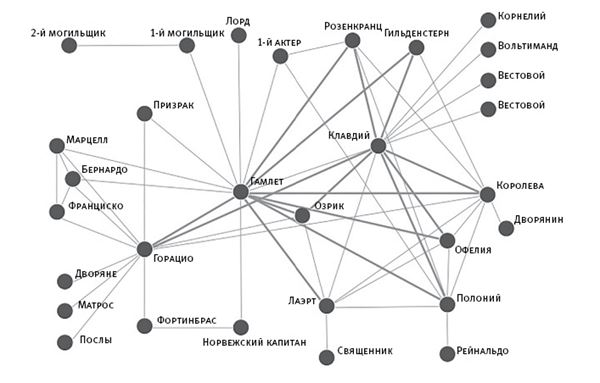 В случайной сети, как давно уже продемонстрировали Эрдёш и Реньи, каждый узел внутри сети имеет приблизительно одинаковое количество ребер, связывающих его с другими узлами. Лучший пример из реальной жизни – это сеть автомагистральных дорог национального значения в США, где каждый крупный город имеет приблизительно одинаковое количество шоссе, соединяющих его с другими городами. Примером же безмасштабной сети является сеть воздушного сообщения США, в которой множество маленьких аэропортов связаны с аэропортами средней величины, а те, в свою очередь, связаны с несколькими огромными и оживленными аэропортами-хабами. Другие сети более высокоцентрализованны, но при этом не обязательно безмасштабны. Так, один из способов понять трагедию, которая разворачивается у Шекспира в “Гамлете”, – это построить граф, отображающий сеть взаимоотношений между его персонажами: на нем видно, что Гамлет и его отчим Клавдий обладают самой высокой центральностью по степени (то есть самым большим количеством ребер; см. илл. 7).