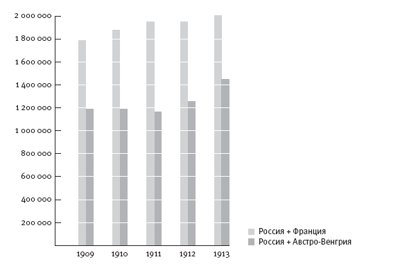 Рисунок 2 демонстрирует, насколько французская и русская армии накануне войны в совокупности превосходили по численности армии Германии и Австро-Венгрии. Если считать в дивизиях (впрочем, численность этого формирования в разных странах разная), положение немцев и австрийцев было еще тяжелее{603}.